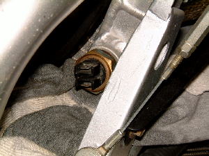 まず電動ファンが回らなかったトラブルです。 ラジエター右に取り付けられた電動ファンスイッチが一番怪しいので これを交換します。 |