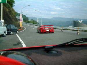 某サービスエリアを出発し箱根に向かいます。 若さんのF50のミラーから見たアルヌーさんのF40。 |